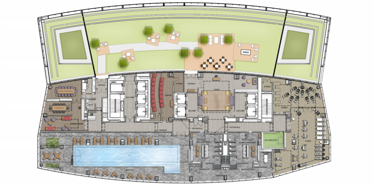 The building was designed by Pelli Clarke Pelli, though as Architects of Record we were responsible for the interior core and other technical aspects. We planned the amenity floor, located in the middle of the building, serviced both the office floors below as well as the residential floors above, for which we were also responsible.