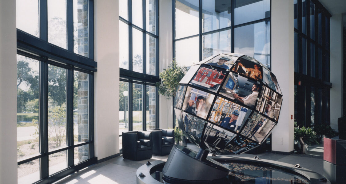 ARCO, the Atlantic Ritchfield Company, an oil company, was once one of the largest companies in the world. The chemical and polymer division was headquartered in Newtown Square, PA, a suburb of Philadelphia. A exemplary research and development building was constructed in 1982 on an arboretum site that had once been a private girls’ school. Bauhaus master Herbert Bayer, for twenty years the corporate design consultant for all of ARCO, created an atrium floor ceramic tile inlay at the headquarters in Newtown Square, Pennsylvania. This is an outstanding example of the midcentury American corporate campus.