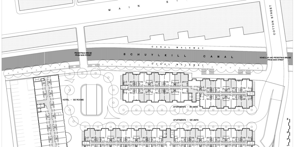 This was the winning entry in a developer competition to transform the industrial site on Manayunk’s Venice Island, formerly occupied by Connelly Containers, into a mixed use project with 220 apartments over 45,000 square feet of retail. Directly adjacent to the center of the bustling Manayunk neighborhood, the design of the new structure was intended to integrate into the character of the place by creating an additional shopping street parallel to Main Street, the area’s existing primary shopping street. Two bridges, one vehicular and one pedestrian only, connect the new street back to Main Street