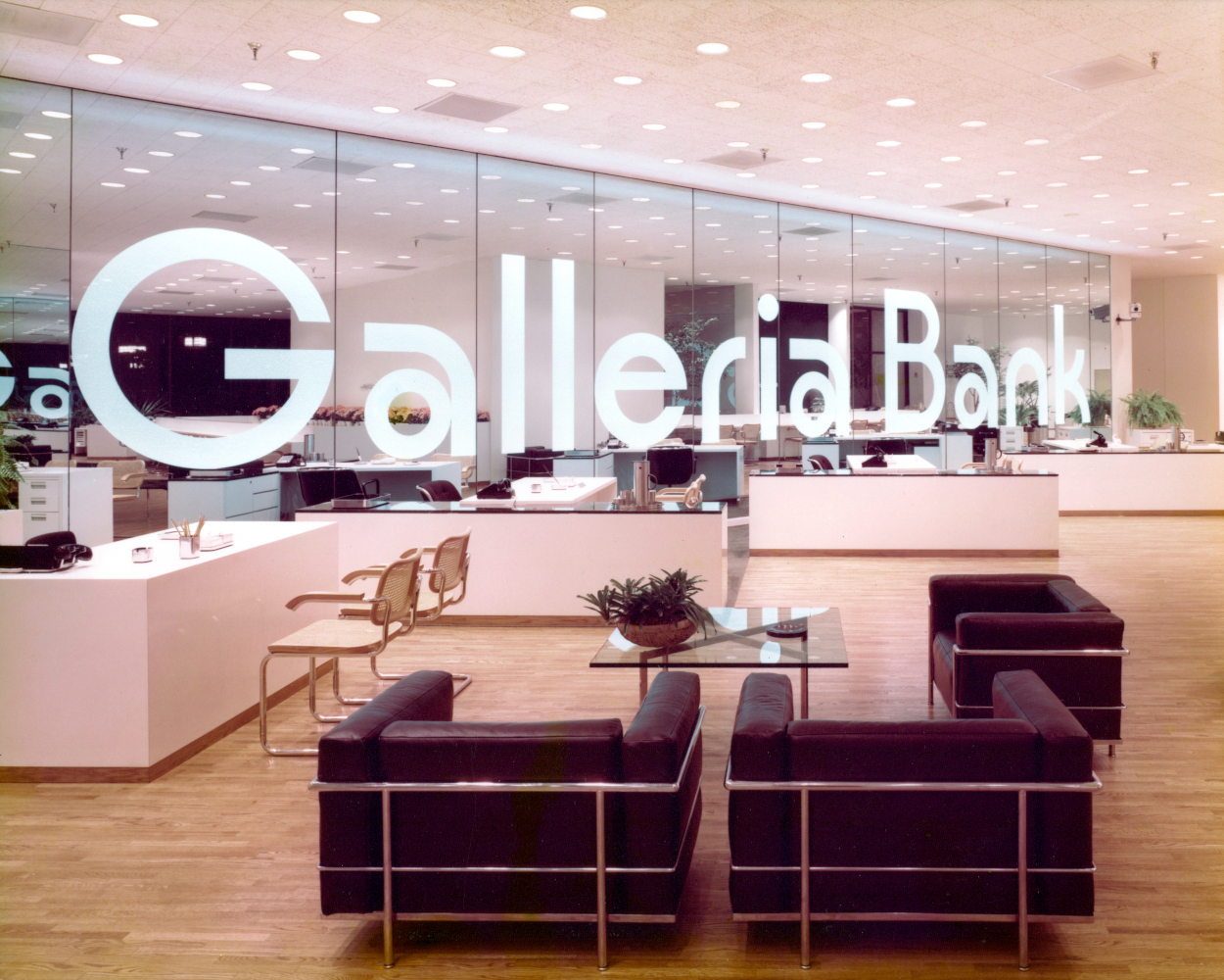 This back-lit mirrored wall was commisioned as the focal point of a branch bank in the famous Galleria shopping mall developed by Hines in Houston, TX. The type face was custom designed.