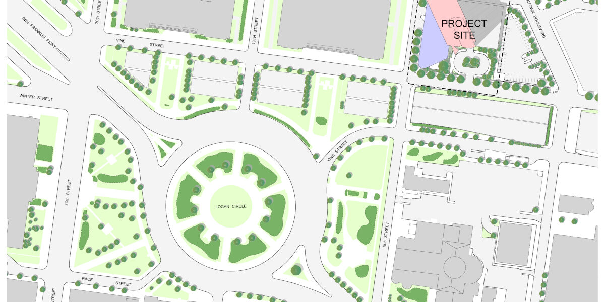 The master plan for this prominent site on Logan Square, one of the original public squares of Philadelphia, proposed a mixed use development of residential condominiums, extended stay hotel, retail and parking. Responding to the adjacent public buildings and square, a 23 story residential condominium building and a 26 story extended stay hotel building were organized around a green pocket park and entry court. Parking was concealed between the towers with retail and other amenities at the perimeter. The total development was to include 350 residential units and 525 cars in the parking garage.