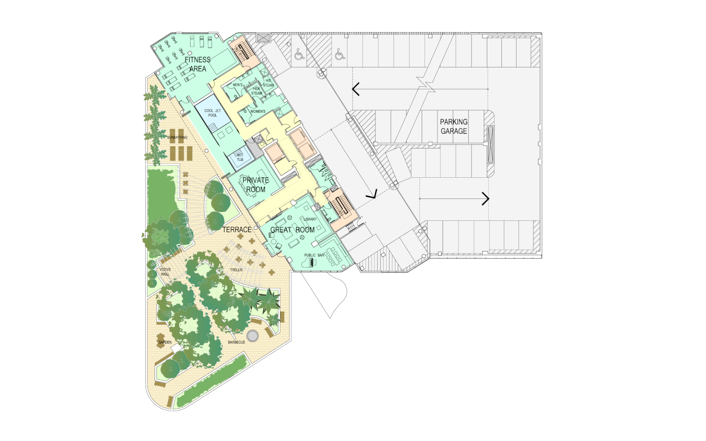 Phase One was originally to be the condominium building with 156 units and 225 parking spaces. The Phase One tower aligned with an adjacent diagonal boulevard to maximize views to Logan Square and to the skyline of Philadelphia. The roof of a one story retail wing was developed as an elaborate garden outside a full floor of amenities including a spa, finess center, chef’s kitchen, dining room, wine tasting room and club.